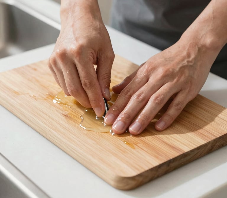 04 — Deodorizing: Coat in coarse sea salt overnight. Work a halved lemon across the board while juicing it. Rest 5–10 minutes, then wipe clean with a damp cloth.